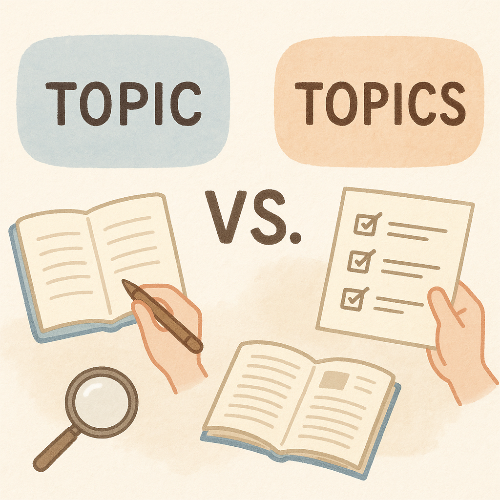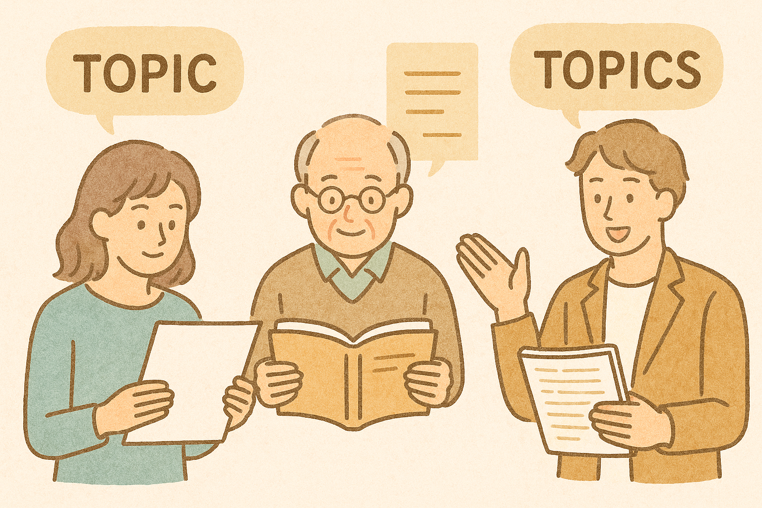 英語での “topic” は「話題」「主題」「テーマ」などの意味を持ち、スピーチや論文、ディスカッションなどの文脈で使われることが一般的です。